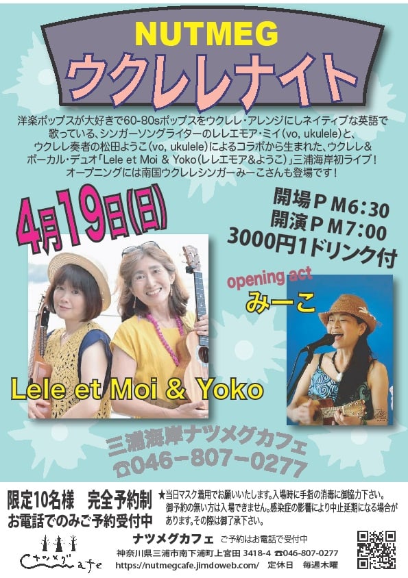 🌟〈LIVE〉4/19(日)ナツメグ・ウクレレナイト Lele et Moi & Yoko opening act みーこ 開場PM6:30 開演PM7:00 終演PM9:00 3000円1ドリンク付 限定10名様 完全予約制 お電話でのみご予約受付中 046-807-0277ナツメグカフェ ★当日マスク着用お願いいたします。入場時に手指の消毒に御協力下さい。御予約の無い方は入場できません。三浦海岸 ナツメグカフェ
